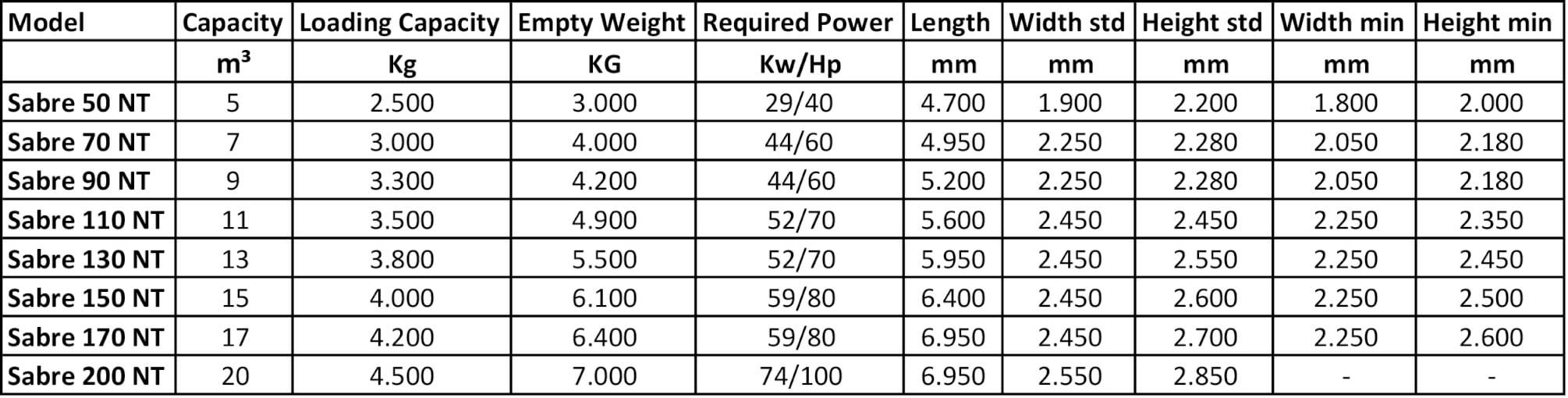 The SABRE model, in the NT versions, comes in 10 cubic volumes: from 5 to 20 m³